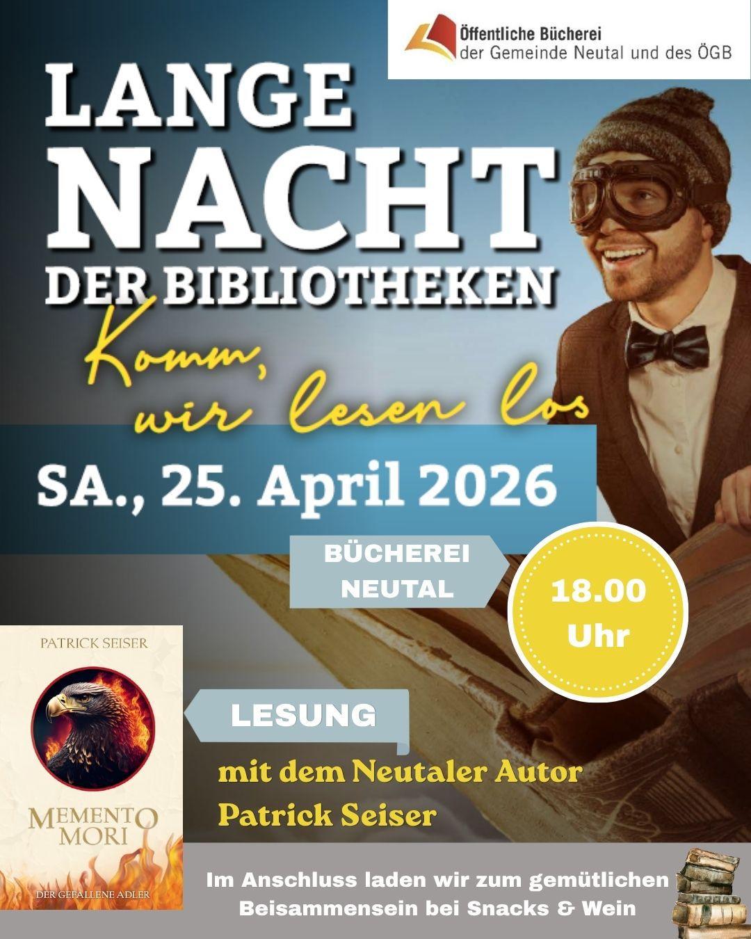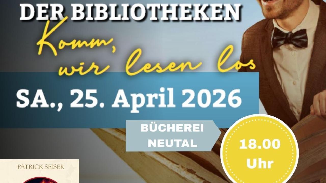 September, 2025 Lange Nacht der Bibliotheken 2026 Komm, wir lesen los!Lesung mit dem Neutaler AutorPatrick Seiser Termin: 02.10.2025Uhrzeit: 16:30 bis 17:30 UhrÖffentliche Bücherei Neutal